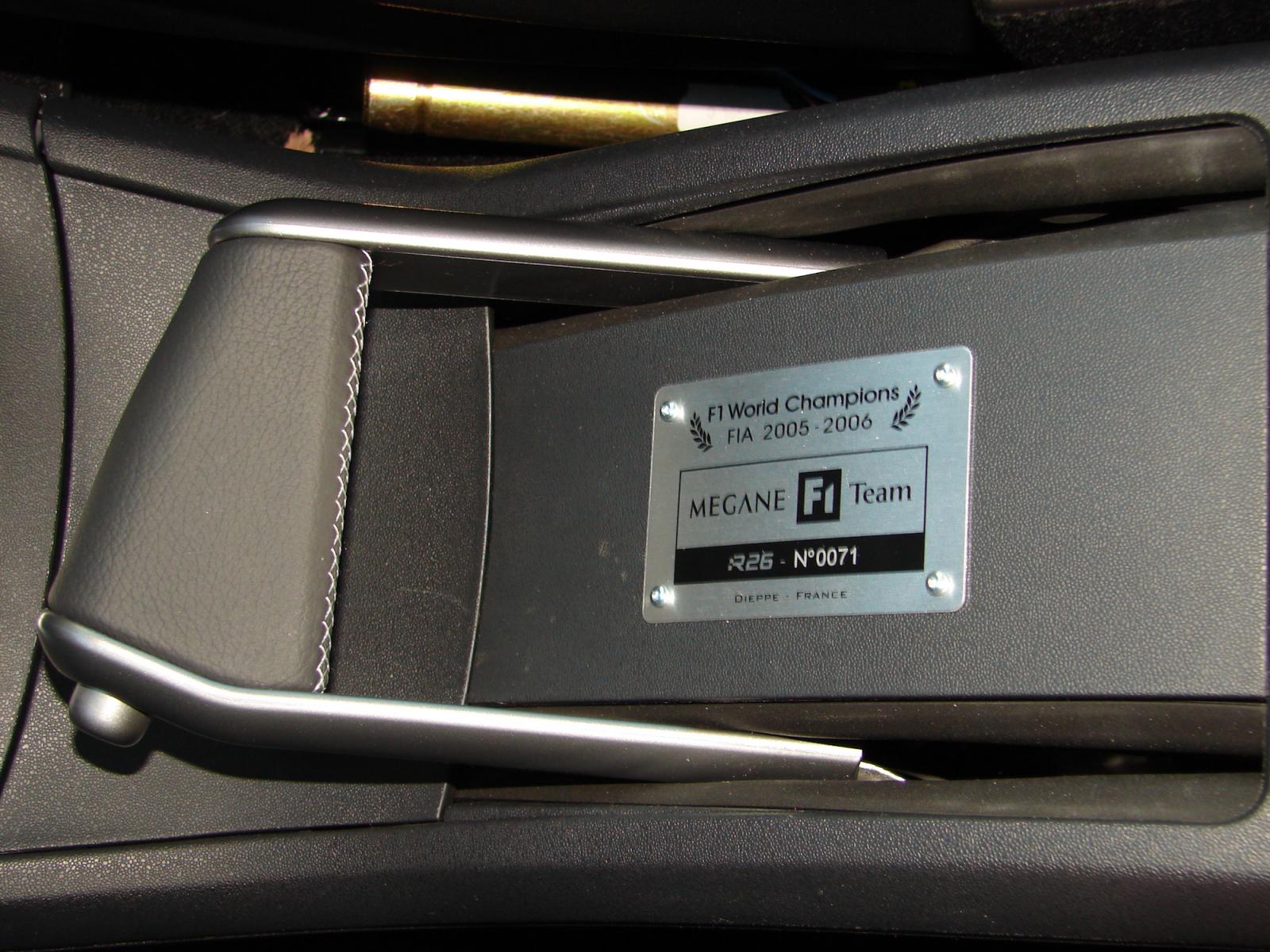 Le 2 litres turbocompressé évolue : 230 ch à 5 500 tr/mn et 310 Nm à 3 000 tr/mn (+5 ch et +10 Nm), avec cartographie moteur spécifique et à un échappement modifié à la sonorité plus virile. Avec 90 % du couple maximal disponible entre 2 000 et 6 000 tr/mn, les performances sont là : 0 à 100 km/h en 6″5; 236 km/h, km DA en 26″6. La boîte de vitesse est manuelle à 6 rapports. Les trains AV à pivot indépendant et train AR à essieu souple à épure programmée sont conservés. Le châssis Cup (amortisseurs spécifiques et de ressorts plus raides) est de série. Les barres anti-dévers AV et AR plus grosses augmentent la raideur anti-roulis. Equipée d’un différentiel à glissement limité NGK, il permet de conserver une efficacité à tout épreuve quels que soient les conditions d’adhérence, le type de conduite ou le type de courbe. Le freinage est largement dimensionné avec des étriers (rouges !) 4 pistons Brembo et des disques ventilés et perforés de 312 mm AV. La Mégane F1 Team R26 est chaussée de Michelin Pilot Sport 2 (235/40 R18). Plaque numérotée et Recaro sont les signes distinctifs intérieurs de la R26. L’équipement de série est correct (régulateur, clim, vitres électriques…) tandis que la présentation est figée avec 5 options disponibles : peinture métallisée ou nacrée, peinture jaune Sirius, Xénon, roue de secours, retrait des strippings « F1 Team R26 ».