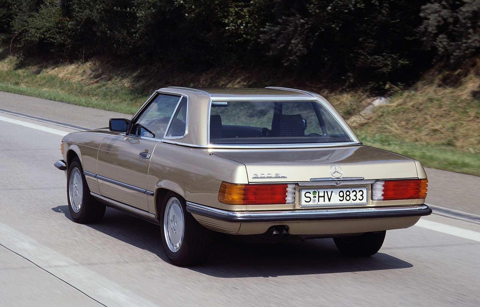 1972 : Lancement de la 450 SL, animée par le nouveau V8 de 4,5 litres M117 à 225 ch, associé à la boîte automatique 3 rapports. Présentation simultanée de la SLC (C107), le coupé à empattement long dérivé de la SL. Premier Salon de Paris pour la SLC.