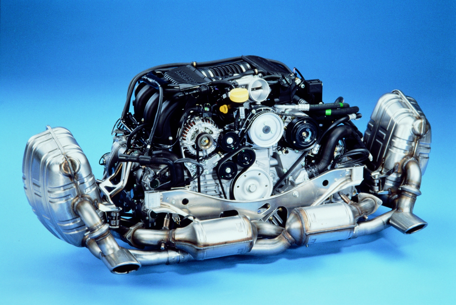 La genèse de la 996 est intimement liée à une double contrainte : économique d’abord, réglementaire ensuite. À la fin des années 1980, Porsche traverse une crise profonde — les ventes s’effondrent, les marges se réduisent — et les nouvelles normes antipollution imposent de repenser intégralement la motorisation. August Achleitner, alors responsable de la planification technique des produits et des concepts véhicules, est chargé d’imaginer une architecture susceptible de sauver l’entreprise. La solution tient en deux idées audacieuses : passer au refroidissement par eau — une quasi-hérésie pour les fidèles du flat-six à air — et partager une base commune avec un nouveau roadster à moteur central, le futur Boxster (986). En 1989, un V8 compact est même monté en porte-à-faux arrière à titre d’essai, avant d’être définitivement écarté. C’est bien le flat-six à eau et quatre soupapes par cylindre qui finira par s’imposer comme la seule solution viable pour répondre aux exigences d’émissions et de puissance.