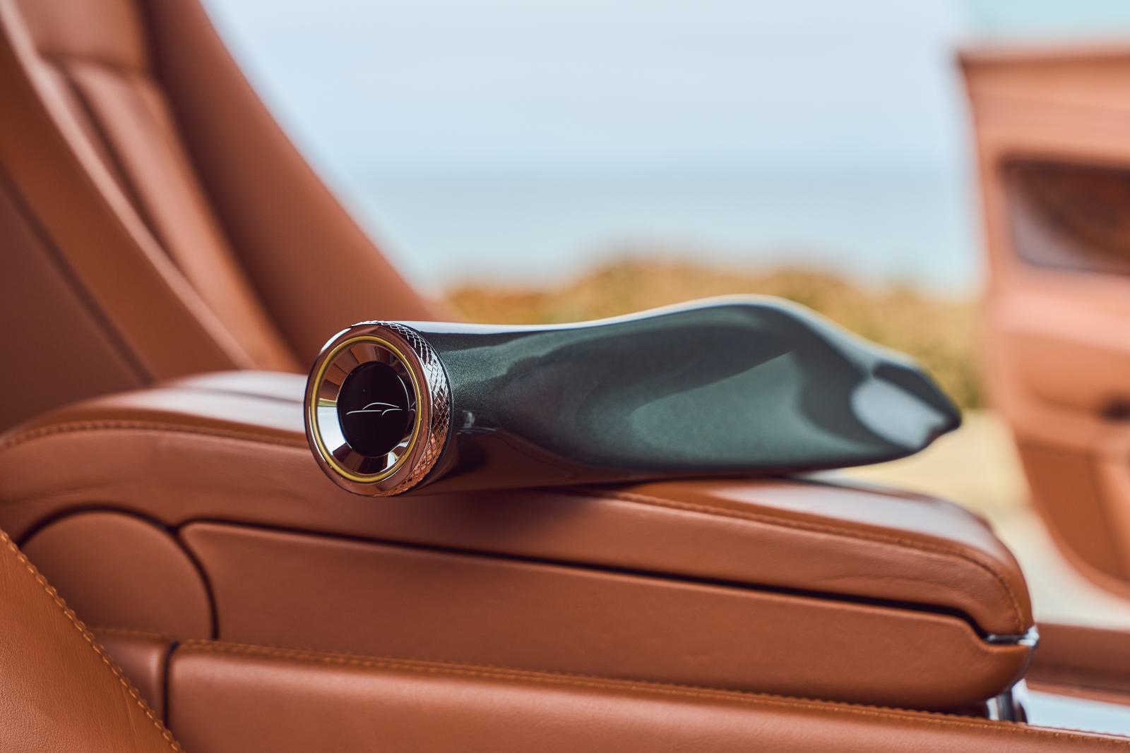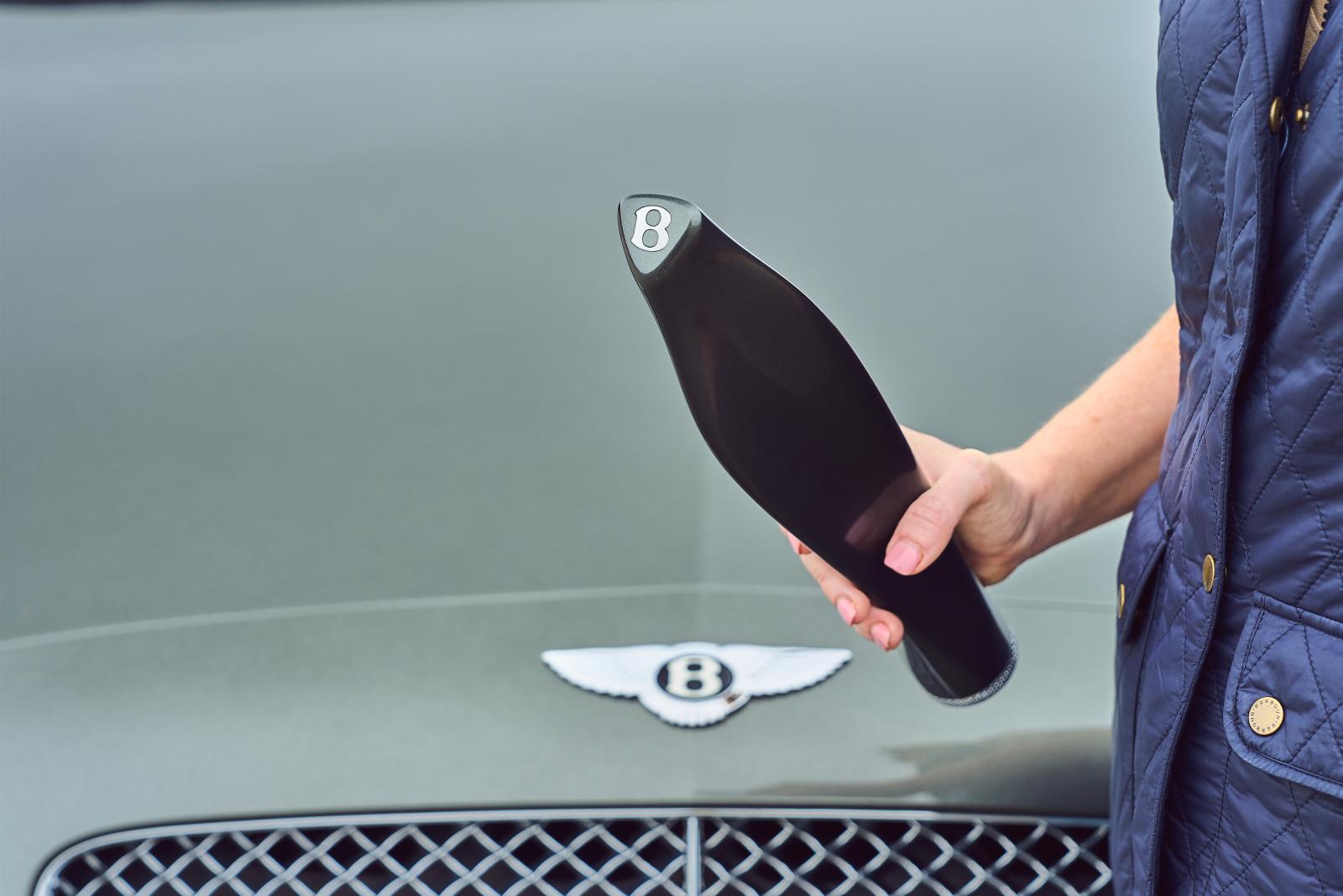 Chris Cooke, responsable des collaborations en matière de design chez Bentley, se penche sur les détails : « Chaque élément de la sculpture du bâton a été inspiré par le Continental GT, et chaque forme a sa raison d’être. Par exemple, l’embout représente un graphique simplifié du Continental GT avec ses trois lignes caractéristiques : la ligne de force Bentley qui part du passage de roue avant et longe les flancs de la voiture ; la ligne de fuite du toit ; et la « hanche » musclée au-dessus de la roue arrière. Tenez le bâton horizontalement et, en le tournant dans vos mains, vous verrez chacune de ces lignes dans les contours de la sculpture ». Par une touche subtile, chaque profil s’aligne parfaitement avec la ligne correspondante sur le graphisme du capuchon.