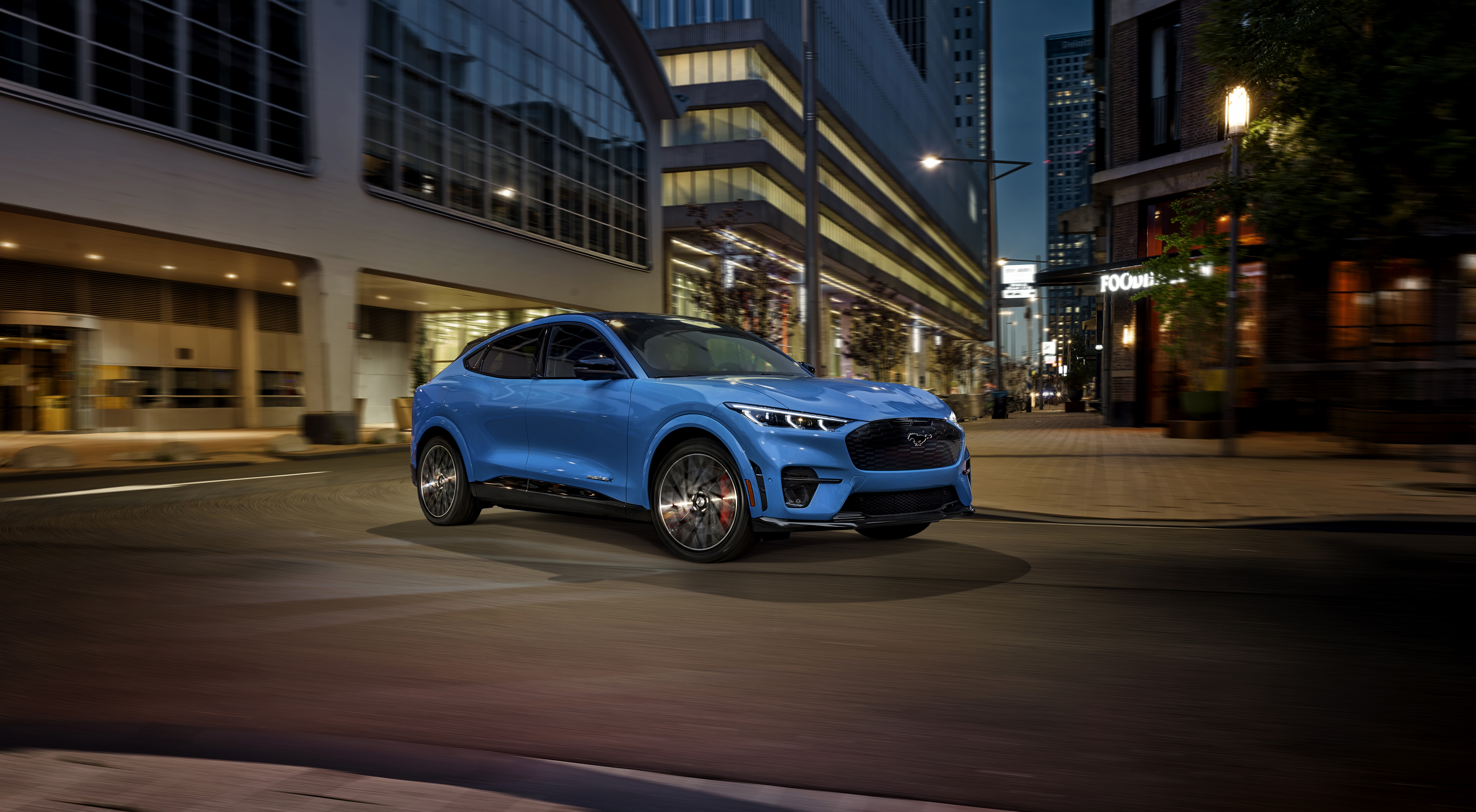 Parmi les spécificités de la Mustang Mach-E GT figurent notamment sa suspension adaptative MagneRide, des jantes en alliage de 20 pouces, des étriers de frein rouge et des coloris uniques, dont le bleu Grabber et le Cyber Orange. L’intérieur comprend également des sièges Ford Performance et un volant spécifique avec des inserts en daim.