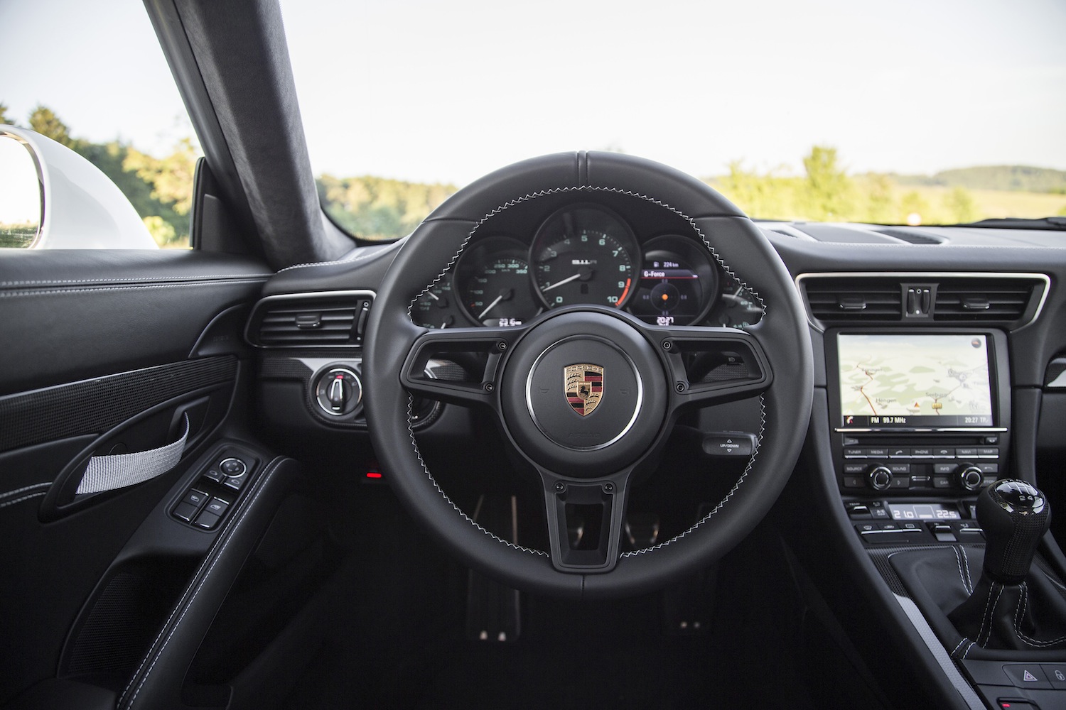 Le conducteur prend place sur des sièges baquets en carbone avec bande centrale en tissu pied-de-poule qui rend hommage à la première 911 des années soixante. Le conducteur pilote la voiture avec un volant sport GT spécifique R de 360 mm de diamètre. Il passe les vitesses via une pédale d’embrayage et un levier de vitesses court spécifique à la version R. Les baguettes décoratives en carbone à l’intérieur comportent une plaquette en aluminium côté passager et rappellent le nombre d’exemplaires limité de la 911 R. Comme c’est le cas sur les modèles GT, les poignées intérieures de porte sont réalisées sous forme de boucles.