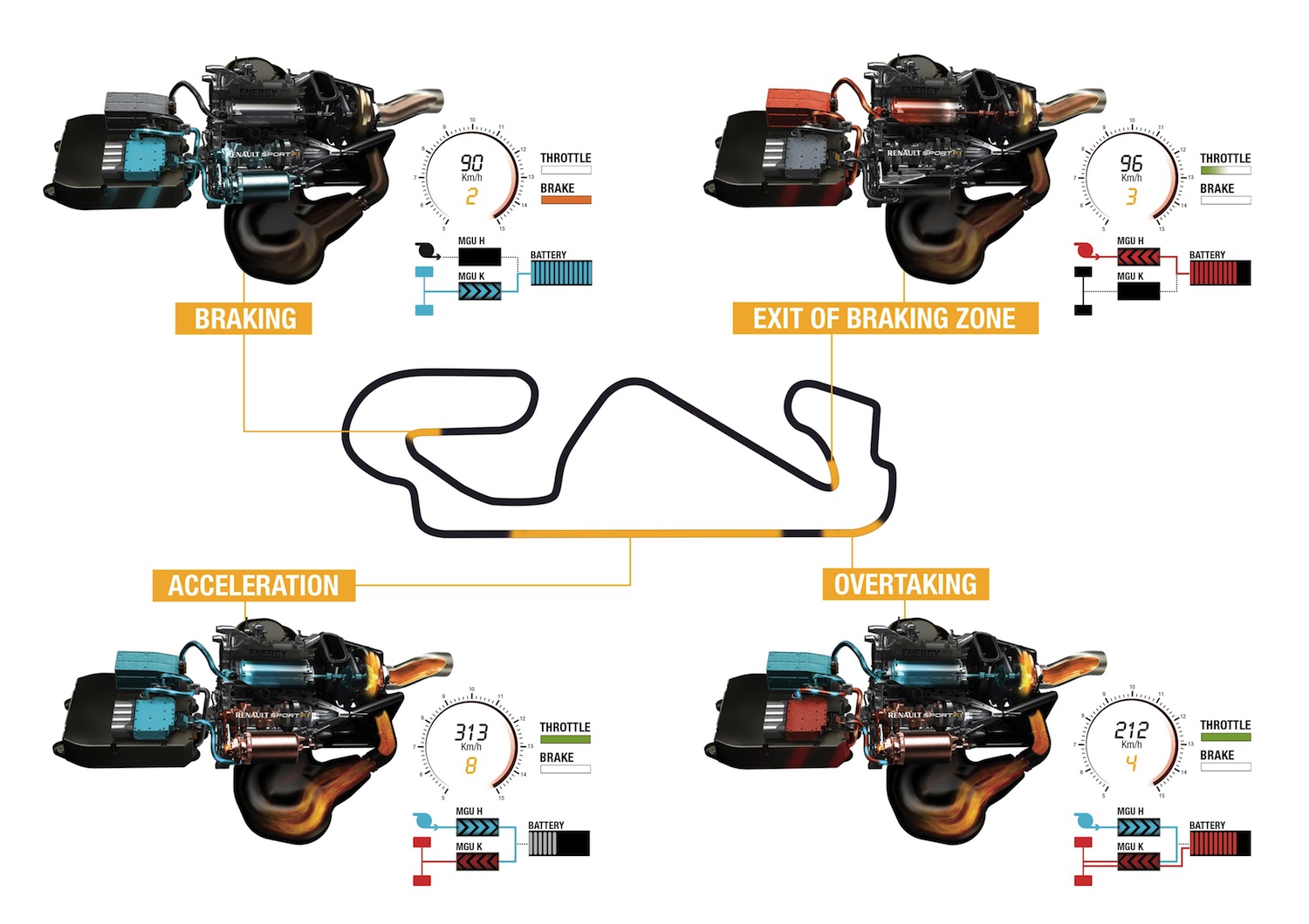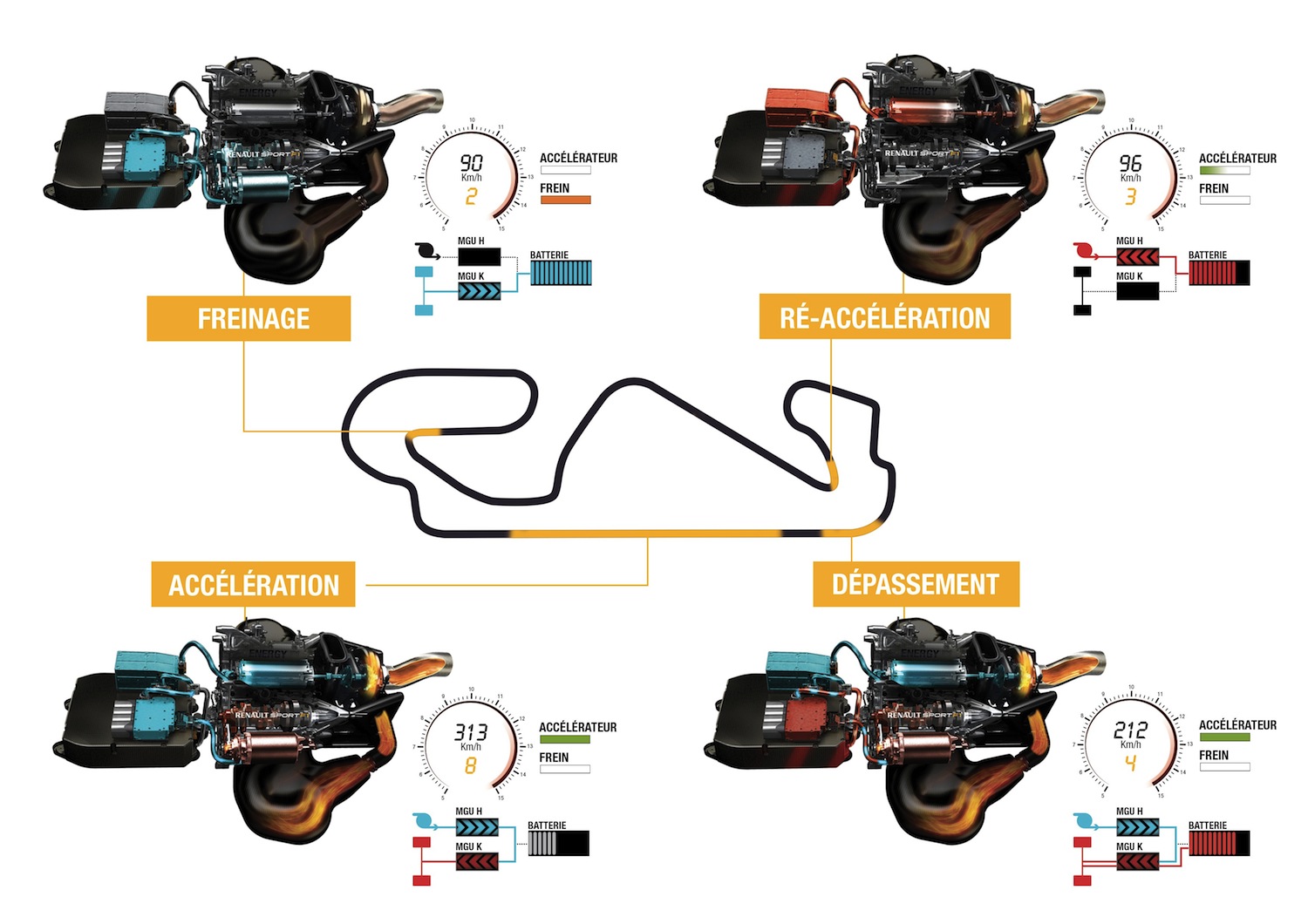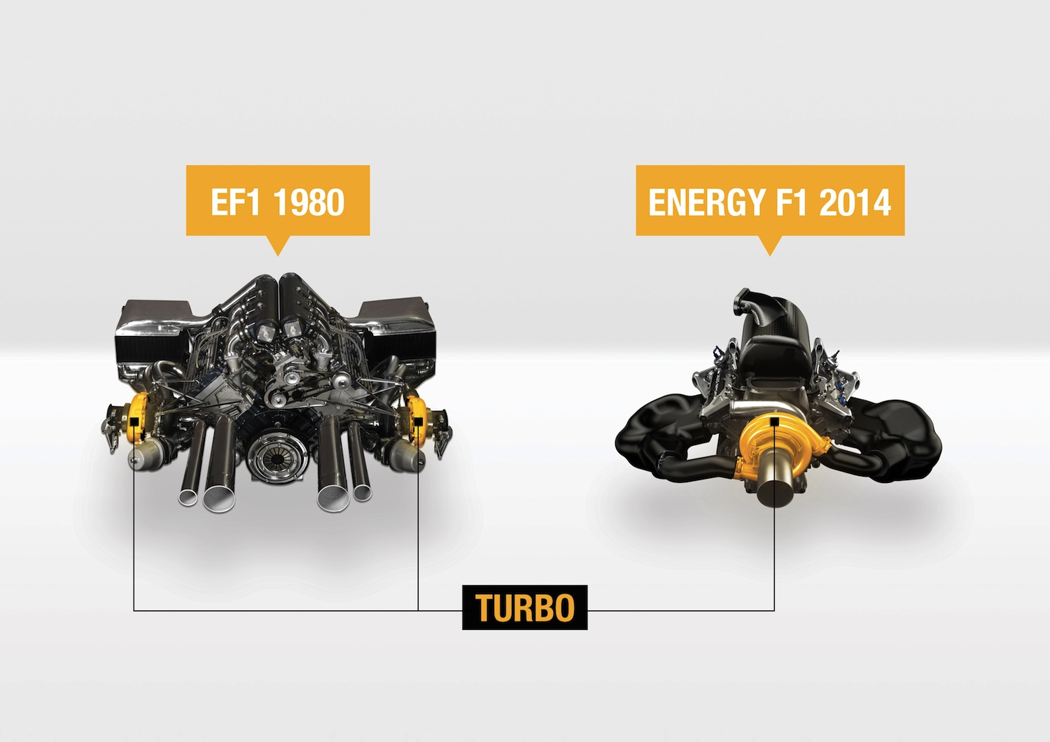 En 2014, la Formule 1 effectue une véritable mue avec l’introduction d’une technologie d’avant-garde. Le nouveau groupe propulseur de Renault en F1 combine l’architecture de l’ancienne génération de moteurs suralimentés, de puissants moteurs électriques et d’une batterie de systèmes de récupération d’énergie sophistiqués pour réduire la consommation de 40% tout en offrant un dynamisme et des performances similaires.