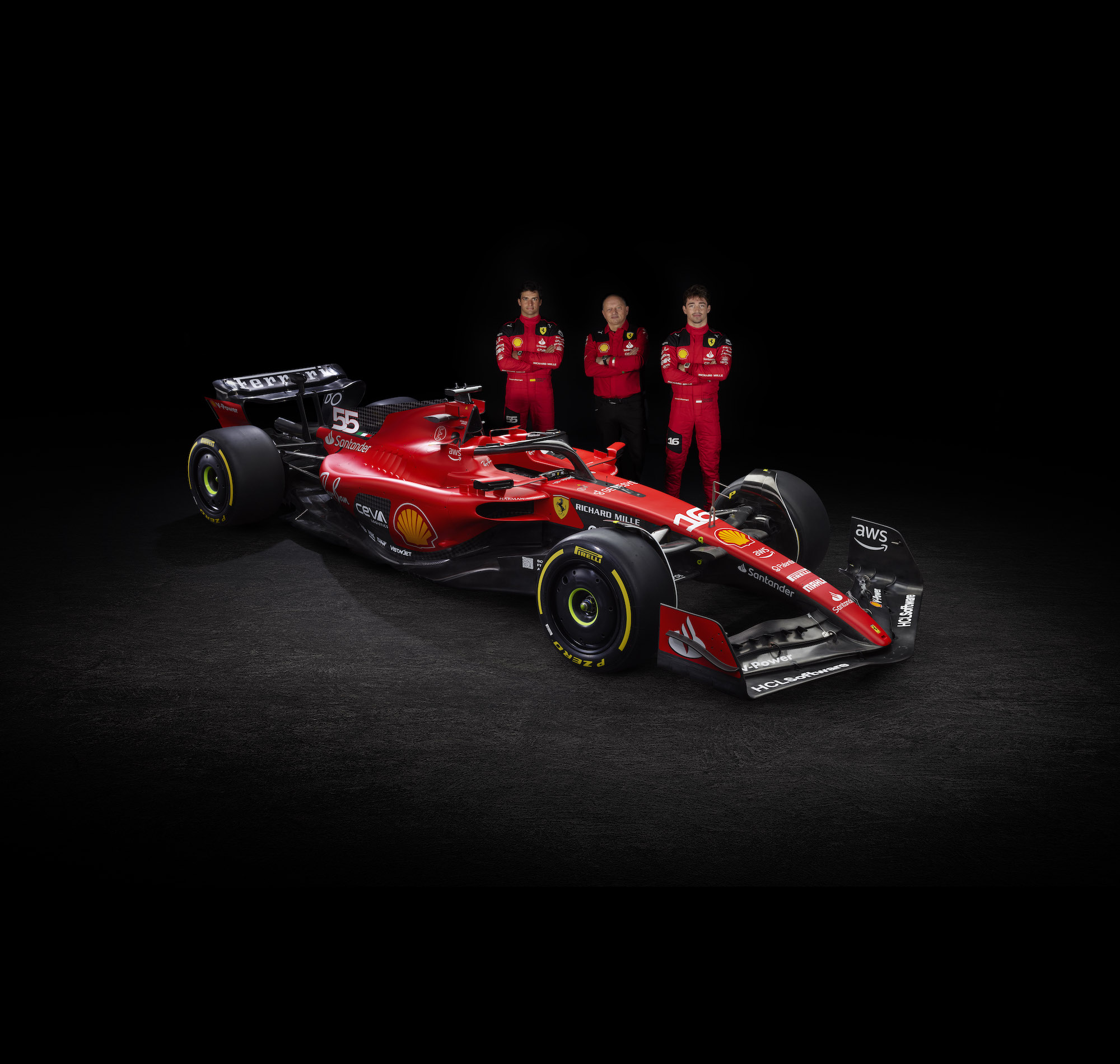 La voiture sur la piste. La SF-23, dont le nom marque un retour au format des initiales de la Scuderia Ferrari combinées à l’année de la compétition, comme cela a été le cas pendant la majeure partie de l’ère hybride, a d’abord été vue en vidéo. Mais ensuite est venue l’annonce que, pour la première fois depuis 2017, la voiture prendrait effectivement la piste le jour du lancement. Fred Vasseur a décidé lequel des deux pilotes serait le premier à prendre le volant en lançant une pièce de monnaie spéciale, avec les numéros de course de Leclerc et de Sainz – 16 et 55 – de chaque côté. Charles a gagné et a conduit la SF23 pour les deux premiers tours, tandis que Carlos a eu son tour peu après.