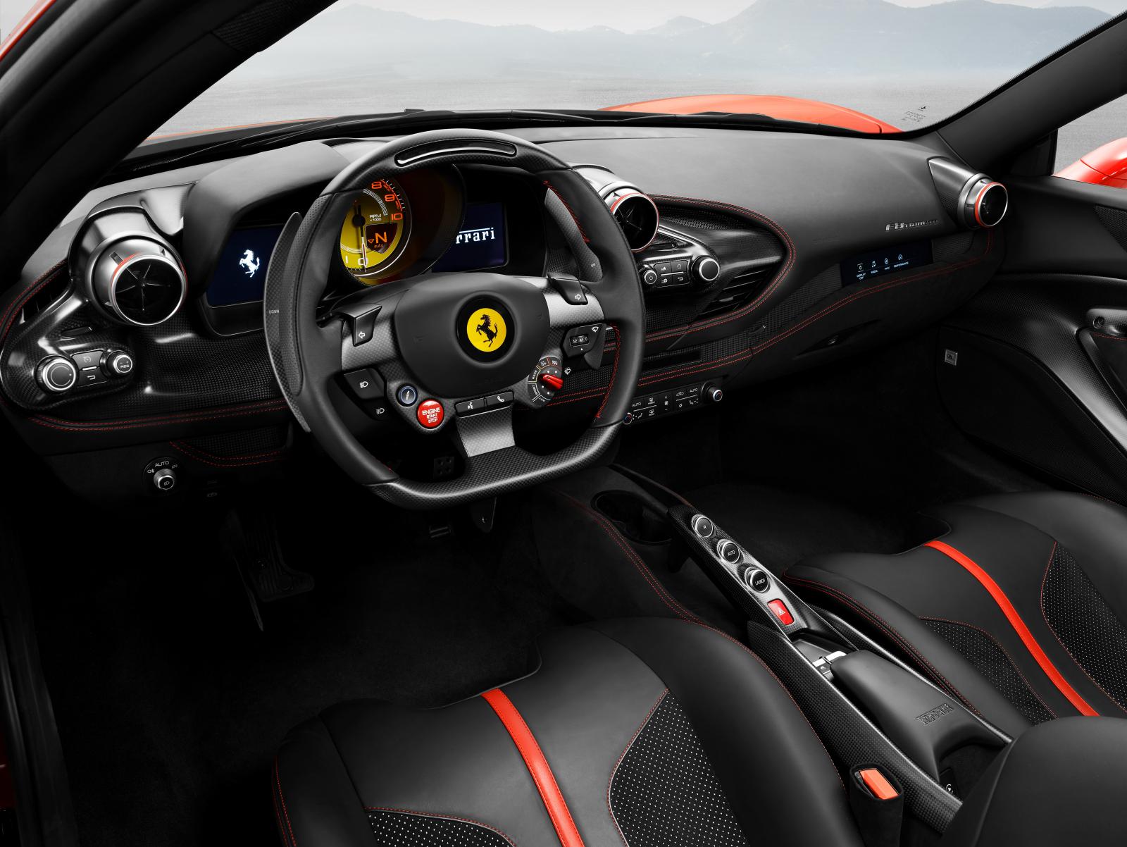 Les roues de 20 pouces sont montées en 245/30 ZR20 AV et 305/30 ZR20 AR et abritent un freinage en carbone céramique ventilé et percé, pincés de par de gros étriers fixes multipistons. Freinage, amortissement, direction, moteur, boite, tout semble travailler à l’unisson dans une harmonie parfaite, quelque soit le mode retenu au Manettino. Ferrari arrive ainsi à remonter d’un cran encore l’efficacité sportive et les compromis. L’habitacle évolue également par touches subtiles mais bien visibles. Le style des sièges a été repensé et tous les éléments du tableau de bord, des panneaux de porte et du tunnel ont été entièrement redessinés tout spécialement pour la voiture. La F8 Tributo est également équipé d’un nouveau volant et de nouvelles commandes montées sur le volant. Les bouches d’aérations sont redessinées, tandis que l’écran tactile de 7’’ côté passager (en option) est inédit dans la berlinette. L’équipement de série est déjà complet, mais le catalogue des options permet de personnaliser encore plus. Histoire de se souvenir que la Ferrari F8 Tributo est aussi une Grand Tourisme, son coffre permet d’emmener 200 dm3 de bagages.
