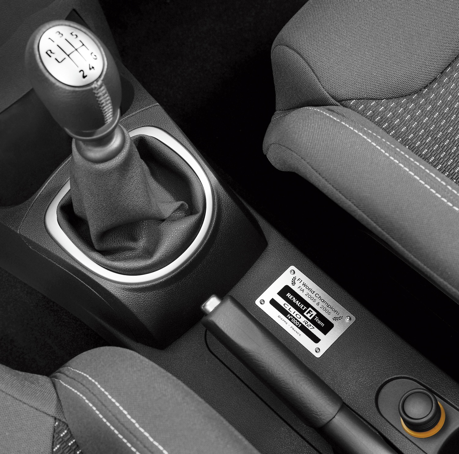 Le moteur 2 litres 16 soupapes F4R de la Clio 3 RS a été copieusement retravaillé. Histoire de prendre des tours, il est équipé d’un calage variable à l’admission gérée par une électronique Valeo bi-mode, ainsi qu’un collecteur d’échappement de type3Y pour un compromis optimal performance, bruit et pollution. Les caractéristiques sont éloquentes avec près de 100 ch/litre avec 197 ch à 7 250 tr/mn et 215 Nm à 5 550 tr/mn. Ce 2 litres accepte de s’envoler dans les tours avec brio mais en raison de l’embonpoint de la Clio 3 RS (1 240 kg) les relances à bas régimes nécessitent de tomber les rapports de la boîte 6 manuelle. Face au verdict du temps, la Clio 3 RS F1 Team R27 est dans la moyenne haute avec 0 à 100 km/h en 7″3; 215 km/h, km DA en 28″0. Mais cela n’est pas le top de la catégorie GTI, les rivales à moteur turbo font mieux sur ces exercices (207 RC, Mini Cooper JCW…). D’ordinaire, avec son assiette plus basse que ses soeurs plus placides, ses suspensions raffermies et ses voies extra-larges, la Clio 3 RS est littéralement scotchée à la route par l’intermédiaire de ses pneus ContiSportContact3 en 215/45 R17. Mais sur la version R27, l’option châssis Cup a été imposée d’office (assiette abaissée et réglages d’amortisseur et de ressorts spécifiques) : quelle efficacité ! Le confort, très ferme, reste encore acceptable, sauf sur chaussée très dégradée où la Clio 3 RS F1 Team R27 tend à suivre les inégalités de la route. Les freins ne changent pas avec des disques pincés par des étriers fixes Brembo (4 pistons AV) partagés avec la Mégane RS qui font des miracles de décélération. La Renault Clio 3 RS F1 Team R27 est une véritable teigne qui conjugue un châssis très sportif qui fait encore plus regretter un moteur pas en phase avec le poids de l’engin. L’habitacle est de belle facture et marque des progrès notables de la Clio 2. L’ergonomie est bonne, mais la position de conduite toujours trop élevée et le volant non réglable en hauteur si vous n’avez pas l’option carte de démarrage. De série la Clio 3 RS F1 Team R27 offre les excellents sièges baquets Recaro très efficaces en maintien latéral. On note une instrumentation trop succincte pour une sportive et une présentation intérieure qui pourrait être plus pimpante. L’habitabilité fait changer la Clio 3 RS de catégorie avec 18 cm de plus en longueur dans l’habitacle et un coffre de 288 dm3 !… Fin du fin, une plaque numérotée dans l’habitacle rappelle l’exclusivité du tirage de cette Clio 3 RS affutée.