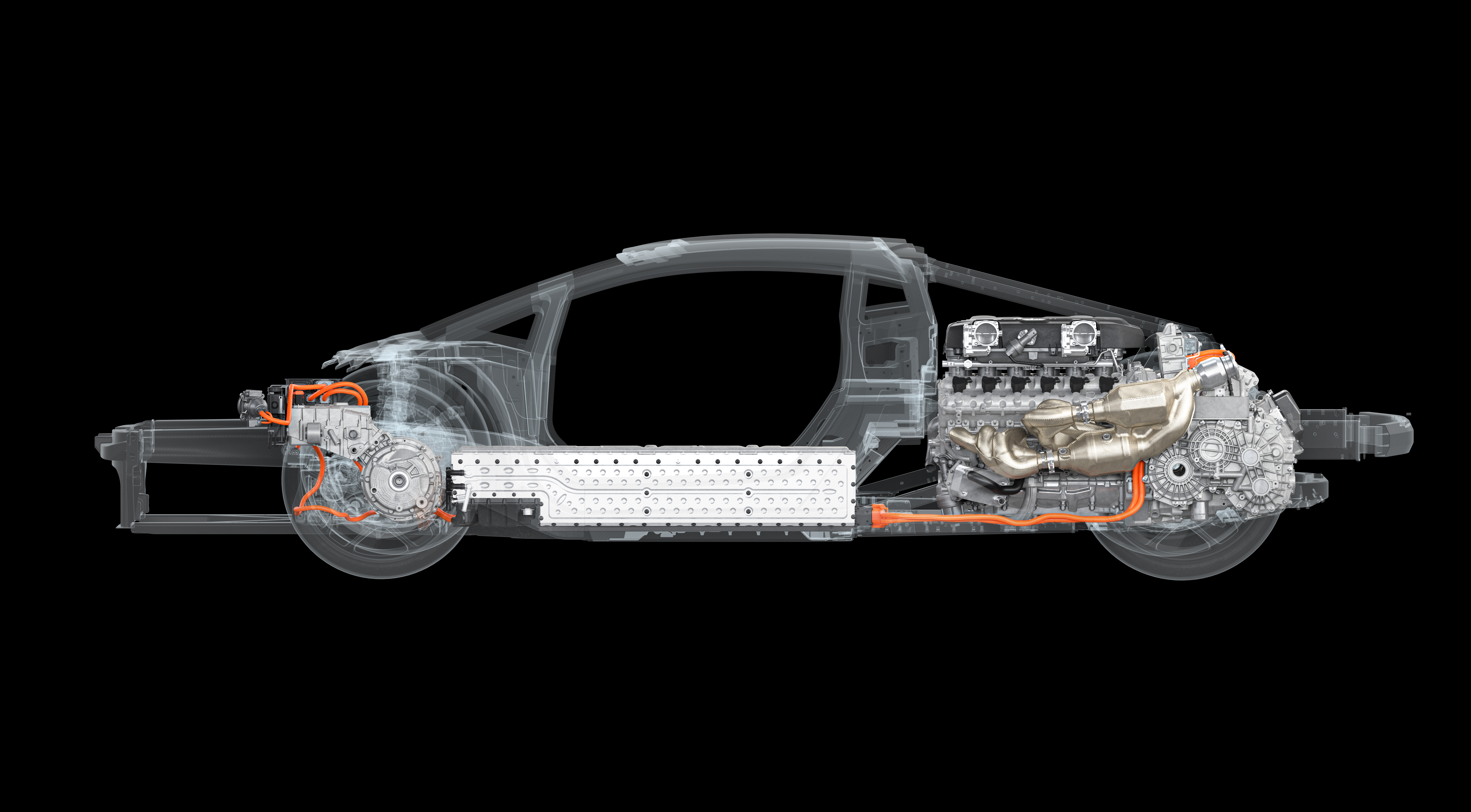 La voiture présente une configuration sans précédent : le moteur V12 atmosphérique de 6,5 litres monté en position centrale est complété par trois moteurs électriques, dont l’un est intégré à la nouvelle boîte de vitesses à double embrayage à huit rapports. Celle-ci est montée transversalement et placée pour la première fois derrière le moteur à combustion. Dans ce qui était le tunnel de transmission depuis l’époque de la Countach, on trouve à la place une batterie lithium-ion qui alimente les moteurs électriques.
