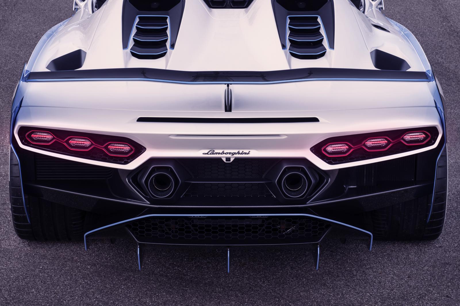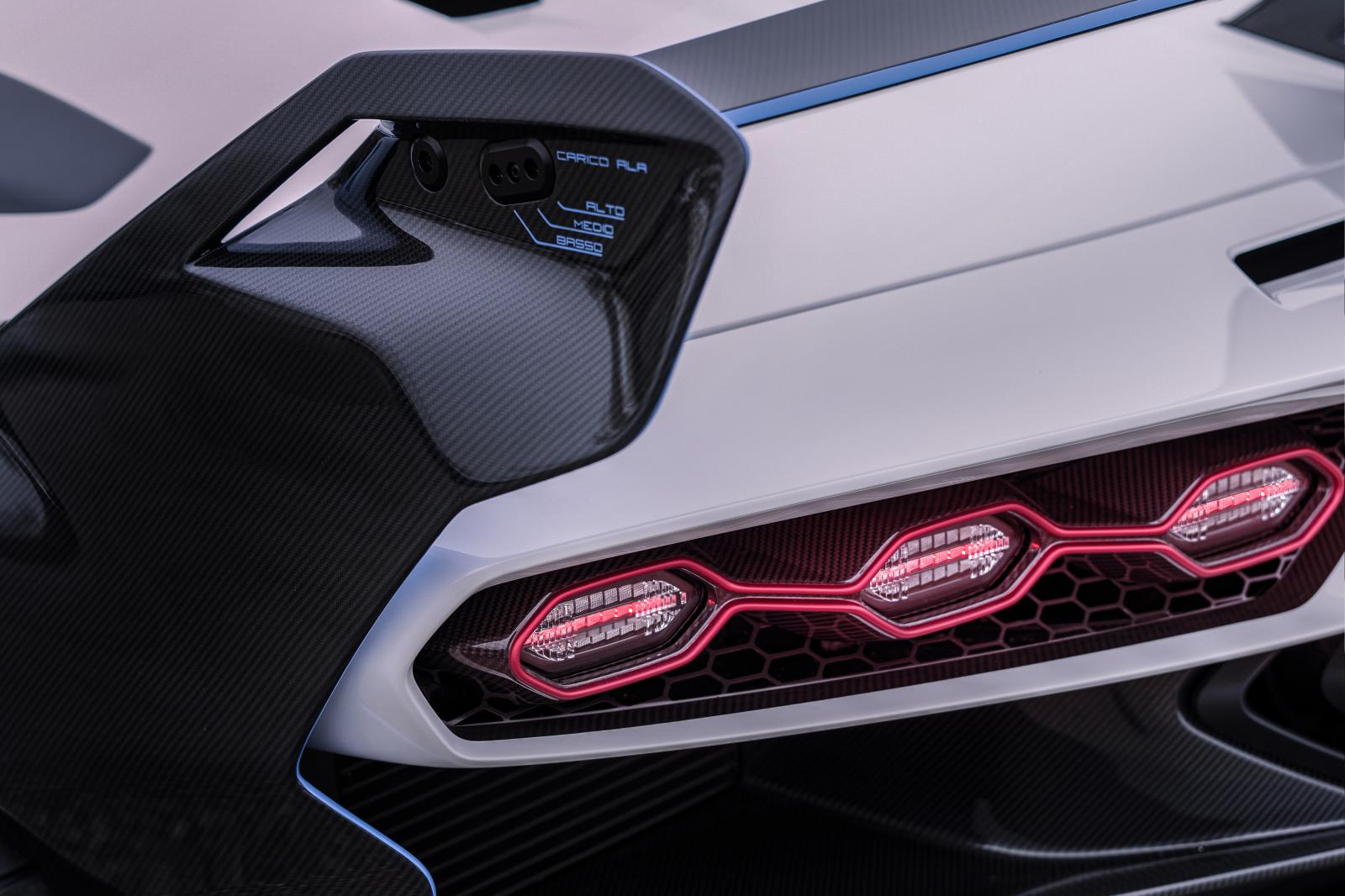 La carrosserie en fibre de carbone a été poncée et polie à la main par les spécialistes de l’aérodynamique de Lamborghini afin de diriger les flux d’air de façon optimale, assurant ainsi une conduite agréable même à grande vitesse. Très prononcé, le splitter avant est entouré de deux ailettes, les prises d’air situées sur le capot sont inspirées de la Huracán GT3 EVO, tandis que les flancs sculptés reprennent les solutions adoptées sur la Essenza SCV12. L’arrière musculeux est quant à lui surmonté d’un grand aileron en carbone réglable sur trois positions : charge faible, moyenne et élevée.
