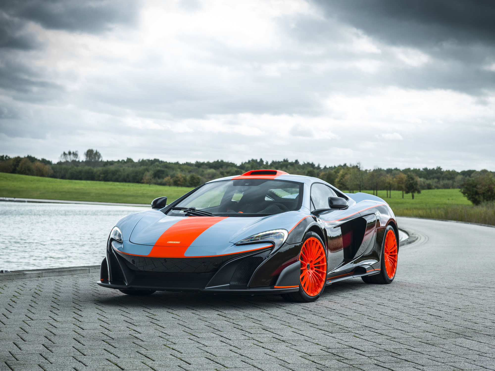 Les nuances bleu clair, noir et rouge de la peinture de la carrosserie – et naturellement la bande centrale orange de la marque – sont bien évidemment reprises des couleurs Gulf Racing qui agrémentaient la voiture de course McLaren F1 GTR ‘Longtail’ de 1977, l’un des véhicules dont McLaren s’est inspirée pour produire la 675LT. Les jantes à 20 rayons, avec finitions Dayglo Orange, continuent le thème. La couleur orange est également utilisée pour les badges qui portent les initiales du client. Le véhicule présente des écopes, une trappe de toit améliorée et un aérofrein en fibre de carbone issus de la gamme d’options MSO pour la McLaren 675LT, tous dans la même couleur que la carrosserie.