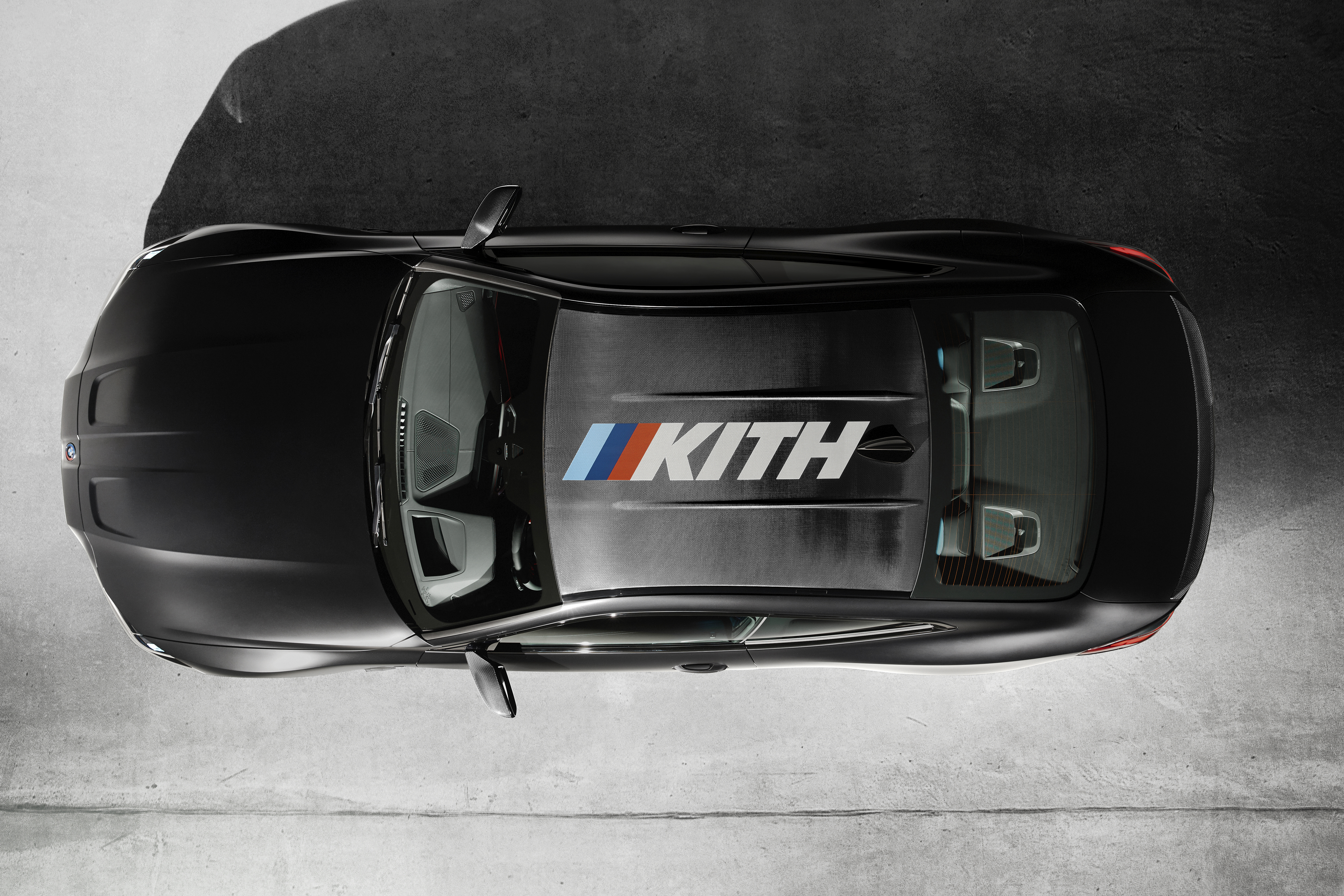 L’insigne de la M4 Competition sur le couvercle du coffre du modèle a été remplacé par un logo Kith noir avec des bandes BMW M du même style. Ce logo apparaît également sous forme éclairée sous les appuie-tête des sièges baquets M Carbon, et le lettrage Kith est estampé dans le cuir noir des appuie-tête et de la console centrale.