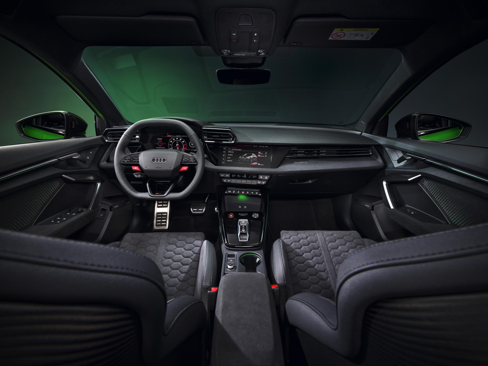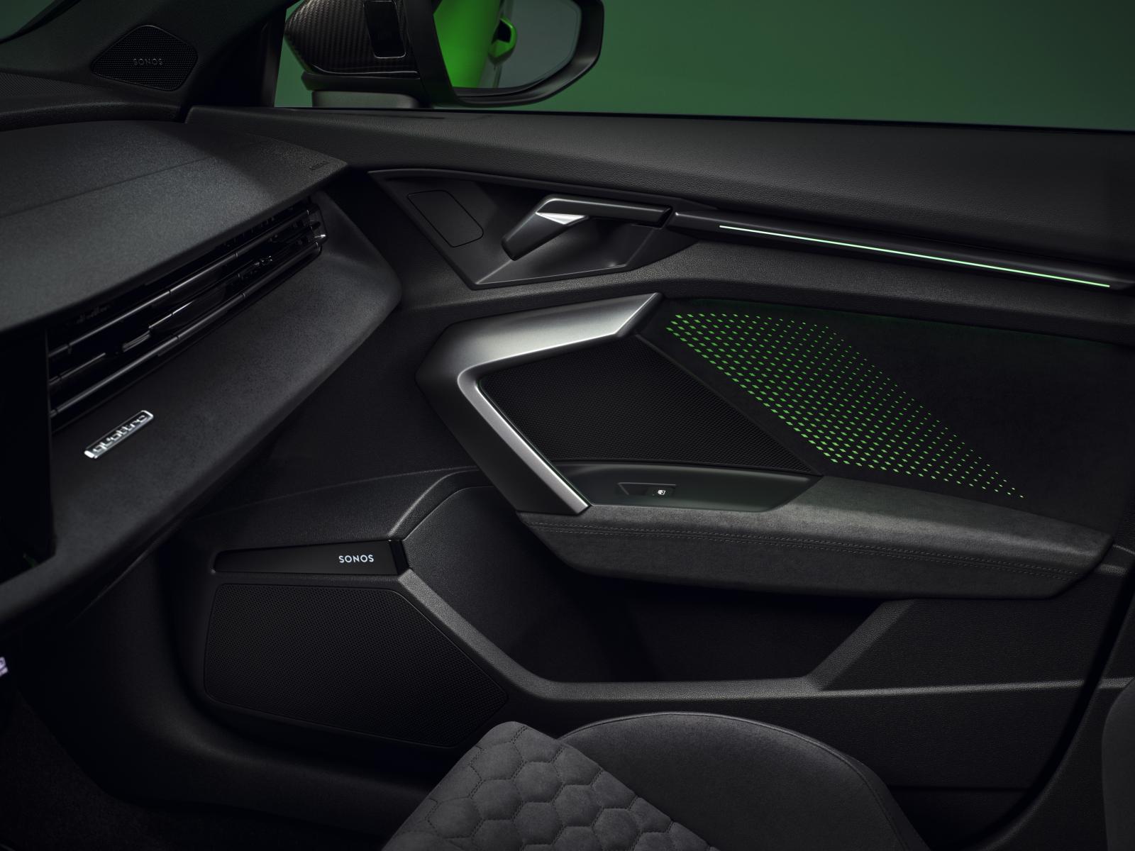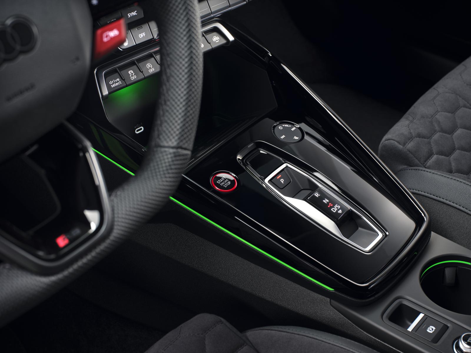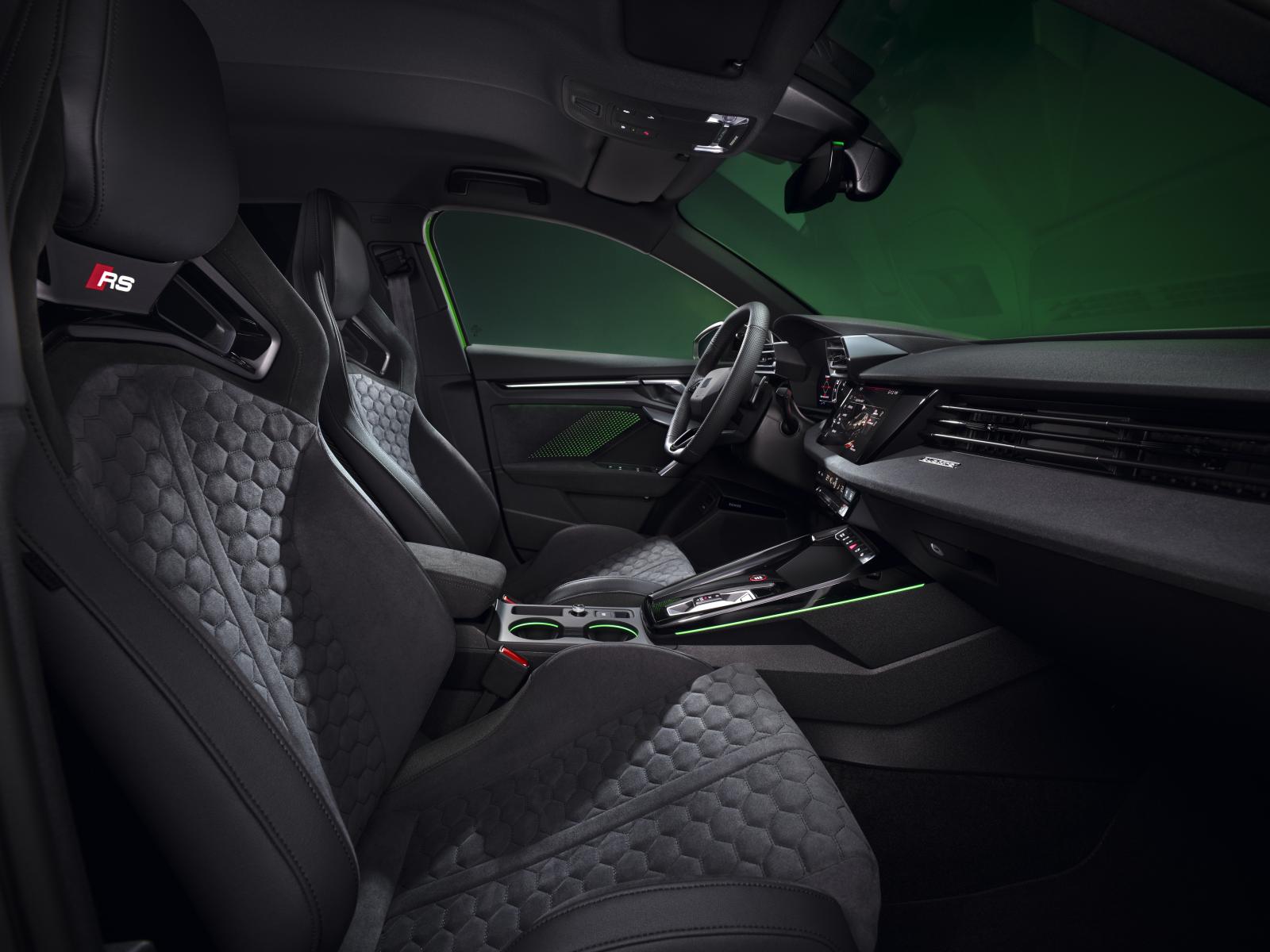 L’éclairage de contour et l’éclairage d’ambiance illuminent les nouveaux éléments de design : l’espace de rangement devant le levier de vitesses au design plus plat, la console centrale avec porte-gobelets et les portes. L’éclairage dit planaire est l’une des caractéristique nocturne visible, où une source lumineuse située dans le panneau de porte affiche des centaines de formes de losanges rétro-éclairés, gravés au laser et de différentes tailles, qui s’allument dynamiquement lors du verrouillage et du déverrouillage de l’Audi RS 3. Cela souligne le design sportif et évocateur. Les poignées de porte, les prises d’air ainsi que les palettes de changement de vitesse sont peintes d’un coloris à effet anthracite, qui scintille en fonction des conditions de luminosité. En plus de la version standard qui inclut deux incrustations en gris palladium avec insert en carbone, il existe également de nouvelles incrustations décoratives composées d’une bande décorative monobloc spécifique à la RS 3 en carbone mat et une nouvelle variante en Dinamica. De plus, le matériau en microfibre est disponible sur commande pour la porte et les accoudoirs centraux.