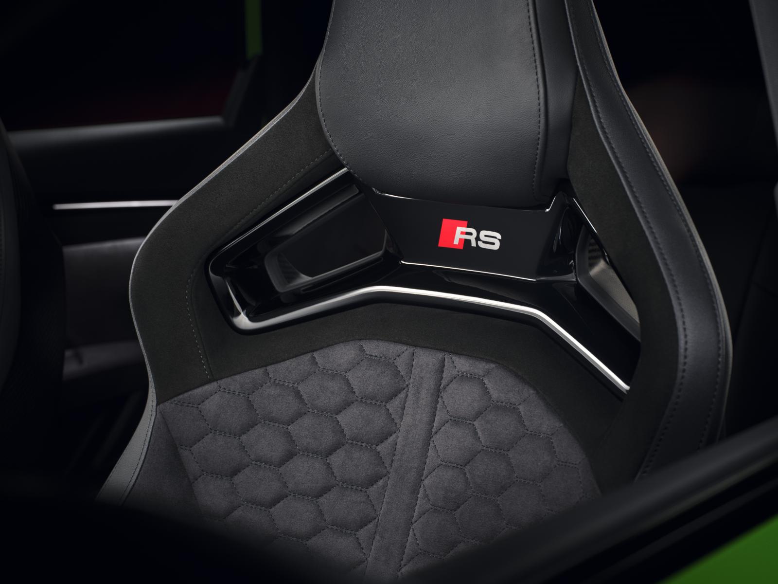 Dans l’habitacle, dominé par des tons sombres, tout est également axé sur la performance : nouveau volant, sièges sport ou sièges baquets RS (en option), éléments en carbone et affichages sportifs. Aplati en haut et en bas, le volant a une allure nettement plus sportive. Qu’il soit en cuir perforé de série ou en Dinamica optionnel avec la présence du repère à 12 heures de couleur contrastée, il s’adapte parfaitement à la main lorsque l’Audi RS 3 prend des virages serrés. Les sièges baquets RS en option offrent un soutien plus renforcé. Le panneau central du siège avec les surpiqûres en nid d’abeille RS est fabriqué en tissu microfibre Dinamica, qui est combiné avec du cuir Nappa perlé sur les appuis latéraux. Sous l’appui-tête, l’insert noir comporte un grand badge RS et, comme l’arrière du dossier en carbone mat, souligne la sportivité de l’Audi RS 3.