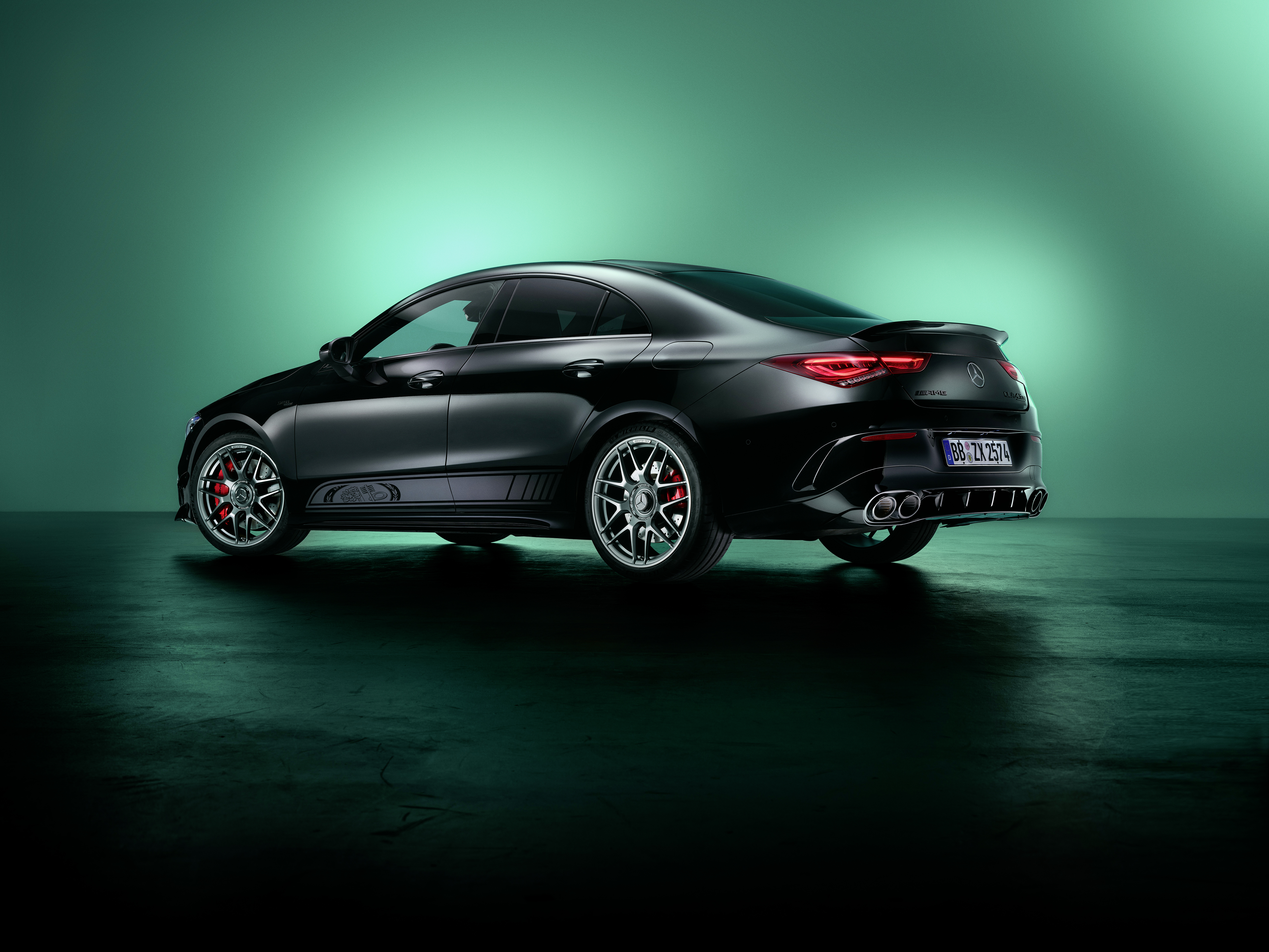 Les modèles spéciaux « Edition 55 » de la catégorie compacte se distinguent également par leur peinture en noir cosmos métallisé ou en blanc numérique métallisé. La palette de couleurs des décalcomanies de chaque côté du véhicule, qui arborent le traditionnel emblème AMG et le losange AMG suggéré, va du gris au transparent assorti. Des jantes forgées AMG de 19 pouces à rayons croisés, peintes en gris titane avec un rebord de jante brillant et un cache central avec des éléments « Edition 55″, viennent compléter l’allure générale puissante. Le bouchon du réservoir de carburant AMG en chrome argenté avec inscription AMG témoigne également d’un grand souci du détail.
