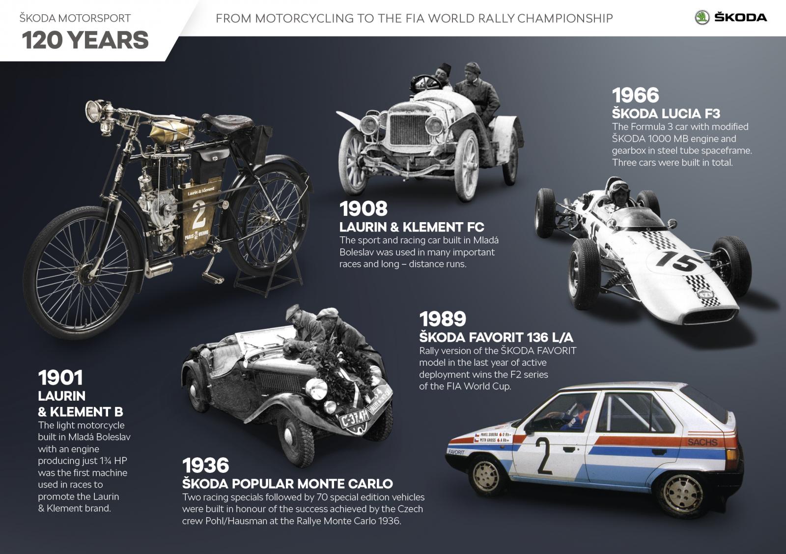 ŠKODA Motorsport perpétue une tradition de 120 ans. En 1901, une moto L&K construite par les fondateurs de la compagnie, Václav Laurin et Václav Klement, participe à une course de 1 200 kilomètres entre  Paris et Berlin. Passant du deux au quatre roues seulement quatre ans plus tard, L&K est également devenu un nom familier dans le domaine des courses automobiles. Après avoir remporté des victoires au Rallye Monte-Carlo et aux 24 heures de Spa-Francorchamps (Belgique), ŠKODA célèbre d’autres victoires sur circuits et en rallye dans les années 1970 et 1980. Aujourd’hui, la ŠKODA FABIA Rally2 evo poursuit l’histoire à succès de ŠKODA Motorsport en remportant des titres dans le monde entier, dans les championnats nationaux comme au championnat du monde des rallyes de la FIA.