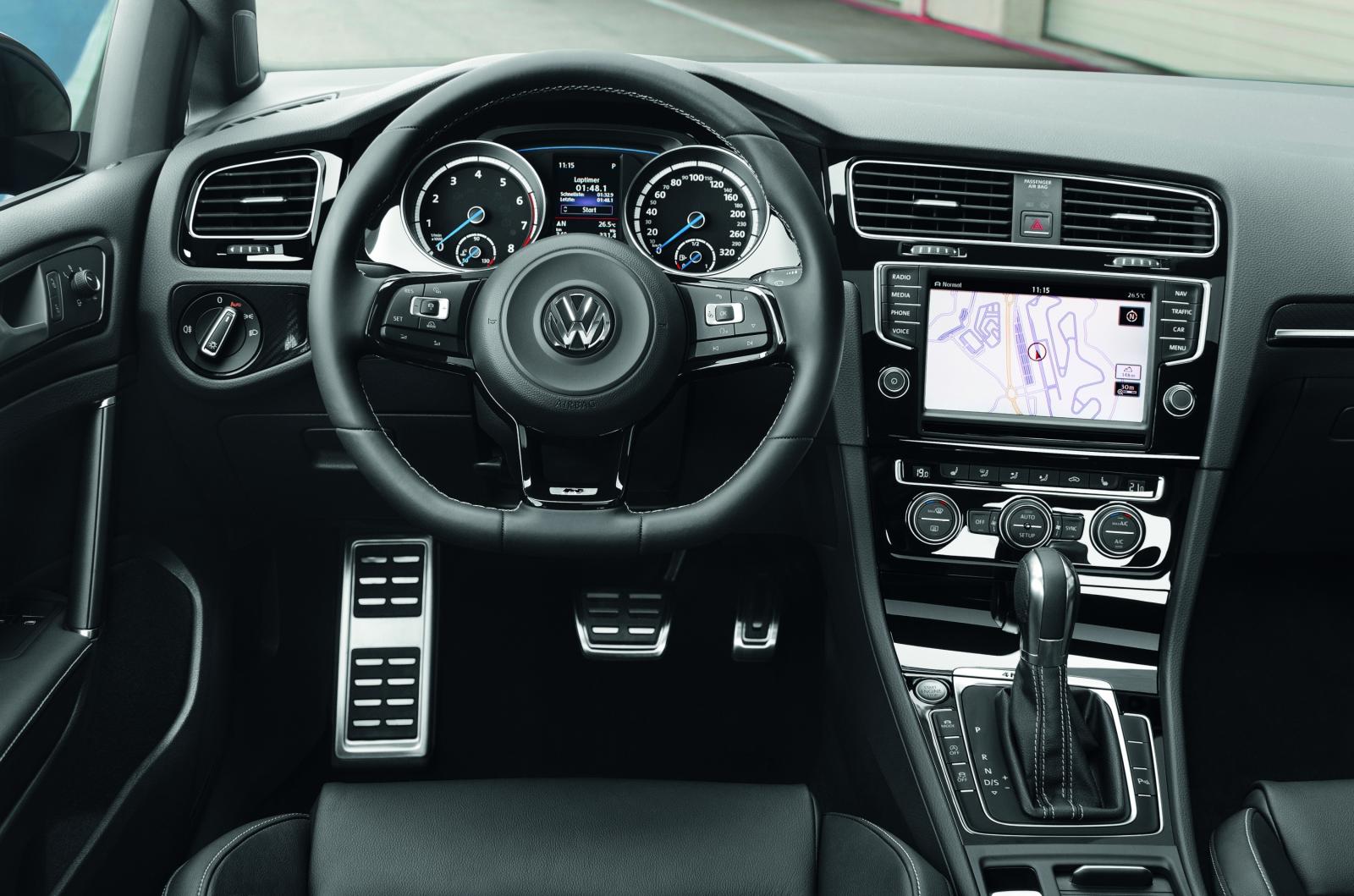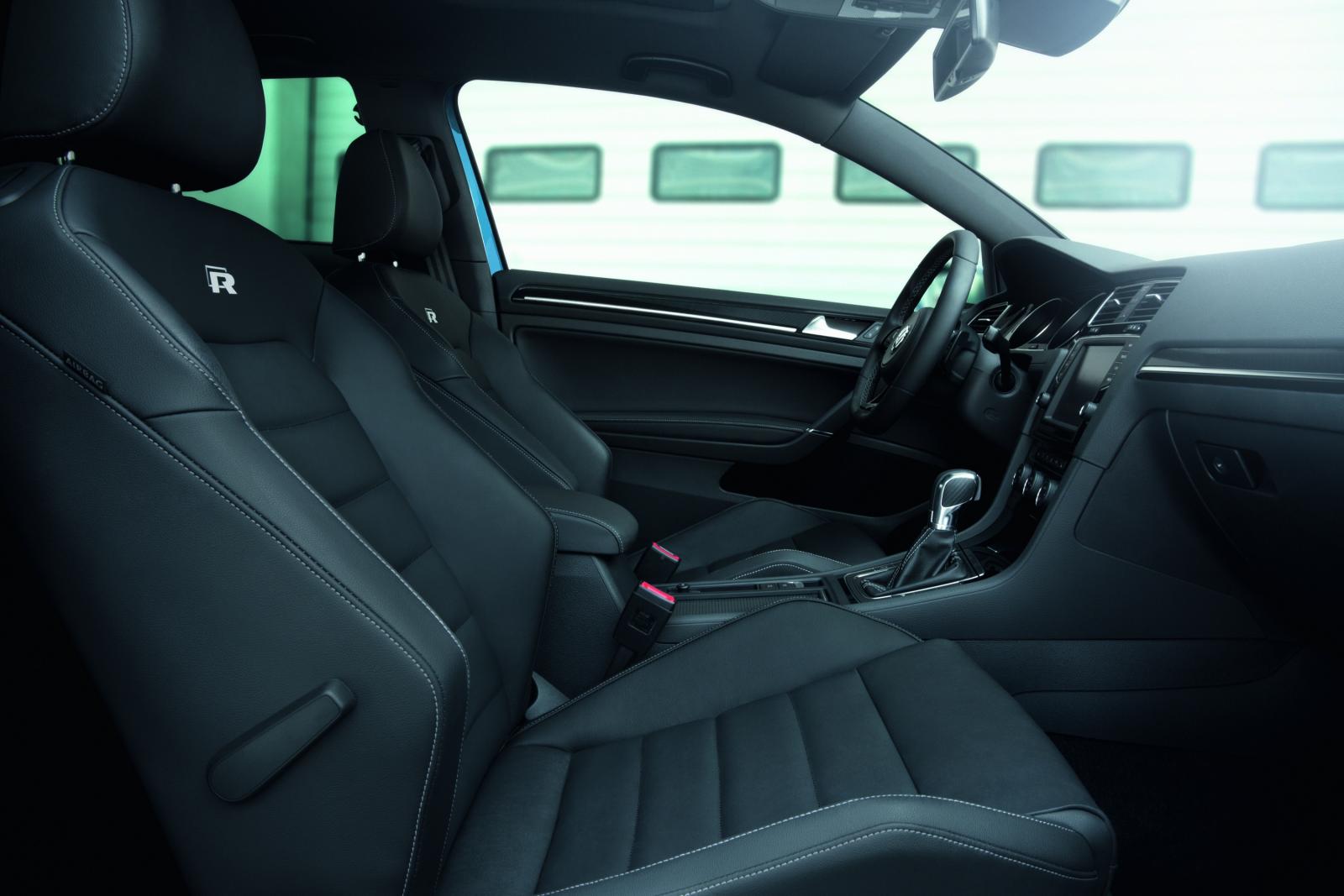 La nouvelle Golf R est dotée d’une myriade de fonctionnalités individuelles et exclusives. Outre les pare-chocs redessinés, les bas de caisse et les jantes 18″ en alliage léger chaussées de pneumatiques 225/40, la Golf R affiche son statut de sportive impériale avec des phares bi-xénon de série, des feux de jour à LED de conception nouvelle (en double U), des feux arrière à LED rouge foncé ou encore une ligne d’échappement à double flux avec quatre sorties d’échappement chromées. À l’intérieur, le fleuron de la famille Golf s’illustre par des sièges Sport en tissu/alcantara, un volant sport à trois branches gainé de cuir, un éclairage d’ambiance, la climatisa- tion automatique et un système radio/CD avec écran tactile.