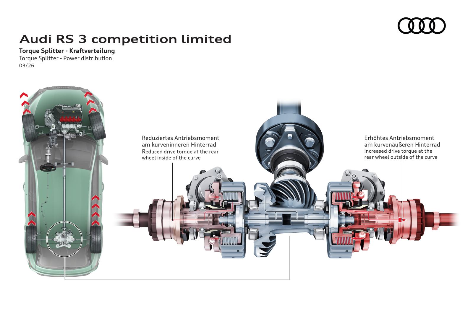 Ce dispositif de répartition du couple reste l’un des éléments clés de l’agrément moderne de la RS 3. Le communiqué rappelle qu’en entrée de virage, le couple est envoyé vers la roue extérieure tandis que la roue intérieure est légèrement freinée afin de positionner idéalement la voiture pour la sortie. Cela permet de limiter le sous-virage classique des compactes puissantes à transmission intégrale et de donner à l’auto une capacité de rotation plus naturelle. Sur cette competition limited, l’ensemble châssis plus pointu, l’aérodynamique retravaillée et la dotation de série en freins céramique devraient logiquement pousser encore plus loin cette sensation de précision contrôlée.